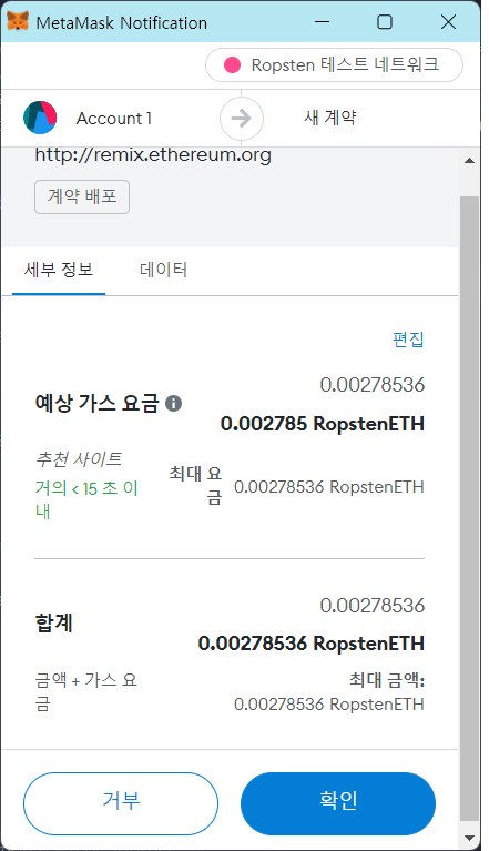 7. IDE 창 왼쪽 메뉴중 마지막에 위치한 Deploy & Run Transactions 아이콘을 클릭하고, 2가지 항목을 변경하고 Deploy 버튼을 클릭한다.