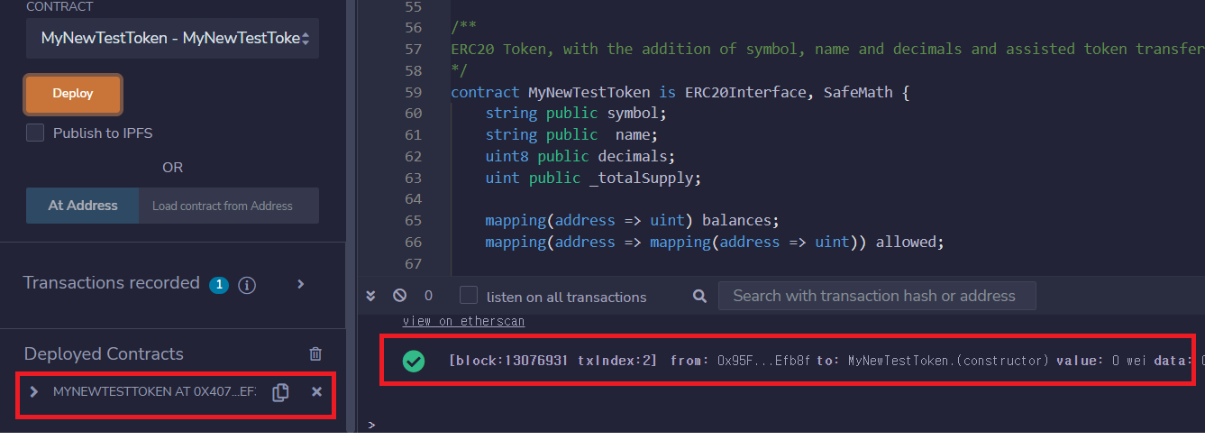 9. 이제 모든 작업이 끝났으므로 잠시 기다리면 IDE창 하단에 녹색 버튼이 나온다. 이때 왼쪽 하단에 노출되는 주소를 복사해서 메타마스크에 추가하면 새로 발행된 나만의 코인 (토큰)을 확인할 수 있다.