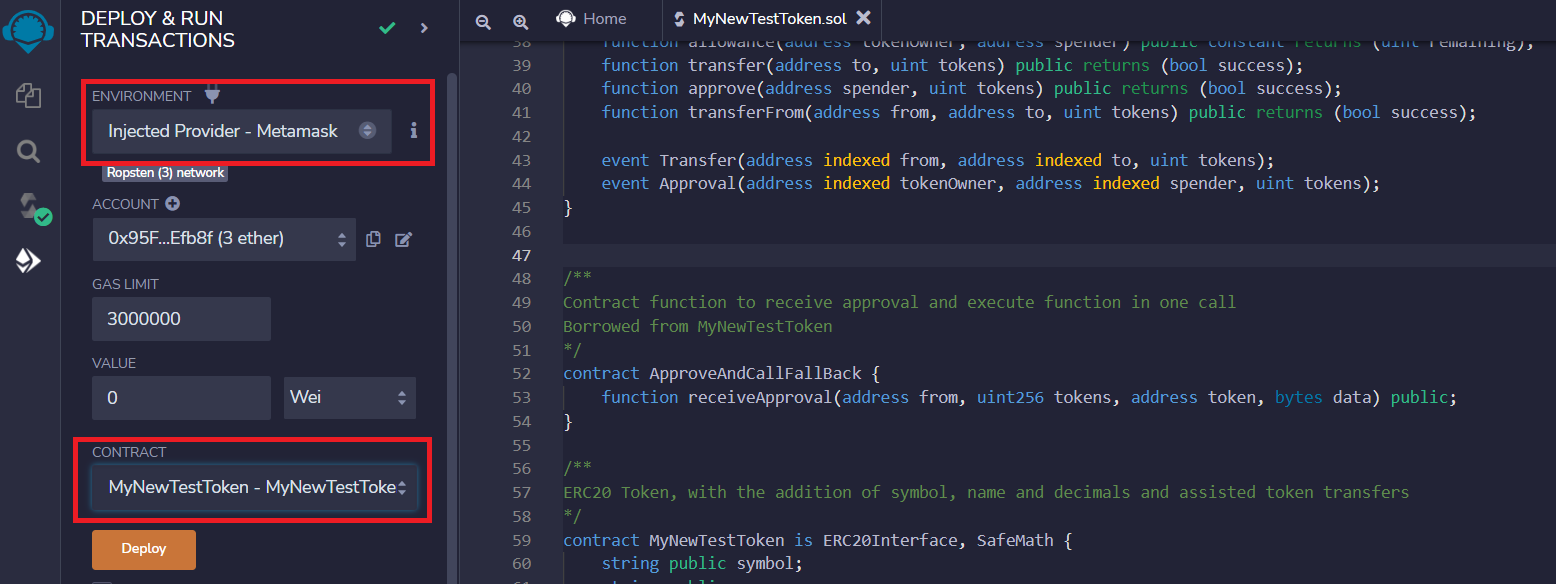 2) CONTRACT : MyNewTestToken - MyNewTestToken.sol 로 변경한다.