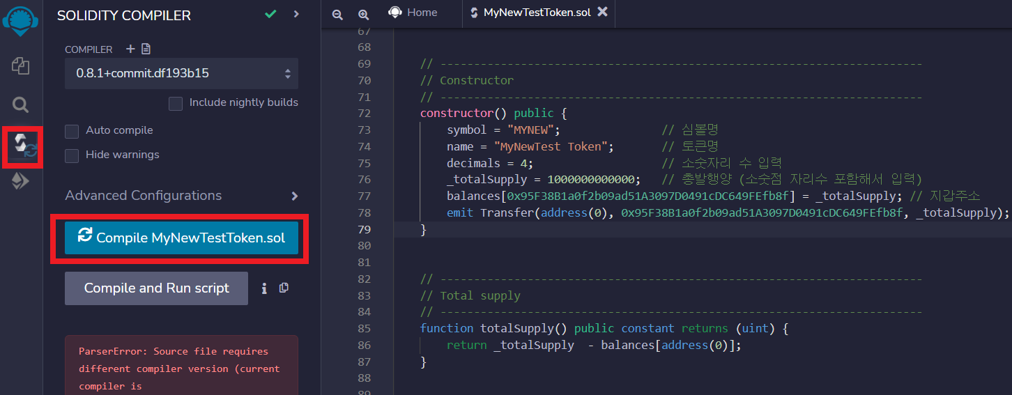 6. IDE 창 왼쪽 메뉴중에서 회전아이콘을 클릭하고, Compile MyNewTestToken.sol 버튼을 클릭해서 컴파일을 한다.