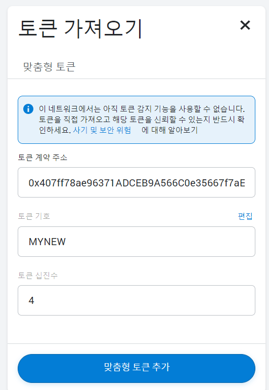 10. 메타마스크 창을 열고 하단에 토근 추가하기 버튼을 클릭해서 생성된 토큰의 주소를 붙여넣는다.