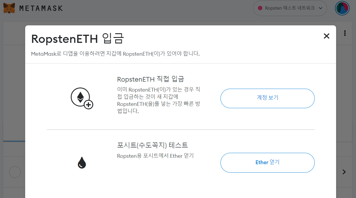 2. 토큰 생성을 위해서는 소량의 이더리움 코인이 필요한데, 우리는 테스트가 목적이므로 테스트 서버에서 이더리움을 무료로 제공받아서 사용한다. 최대 5eth를 무료로 지급 받을 수 있다.