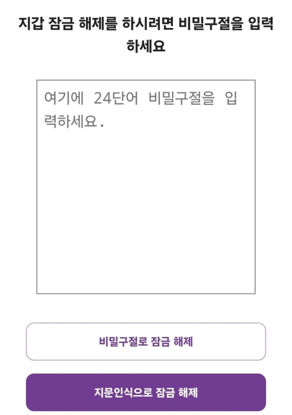 • 지갑 접근 인증: 비밀구절 없이는 지갑에 접근할 수 없습니다.